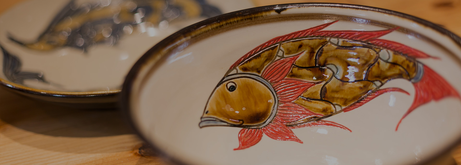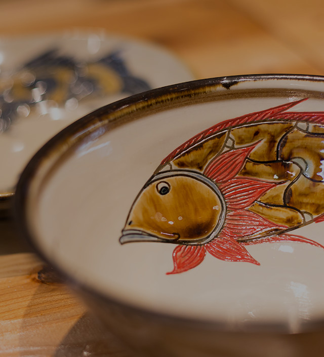 『島唄居酒屋 喜山』のお皿やグラスなどすべて、沖縄の伝統工芸である”やちむん”で揃えています。当店の代表が直接、読谷村へ足を運び選りすぐりのお皿やグラスを買い付けしています。また店内のテーブルやイスはすべて手作りで作っており、どれも愛情がこもっています。